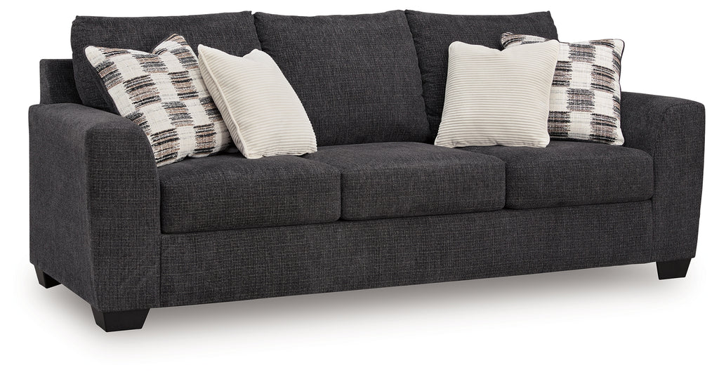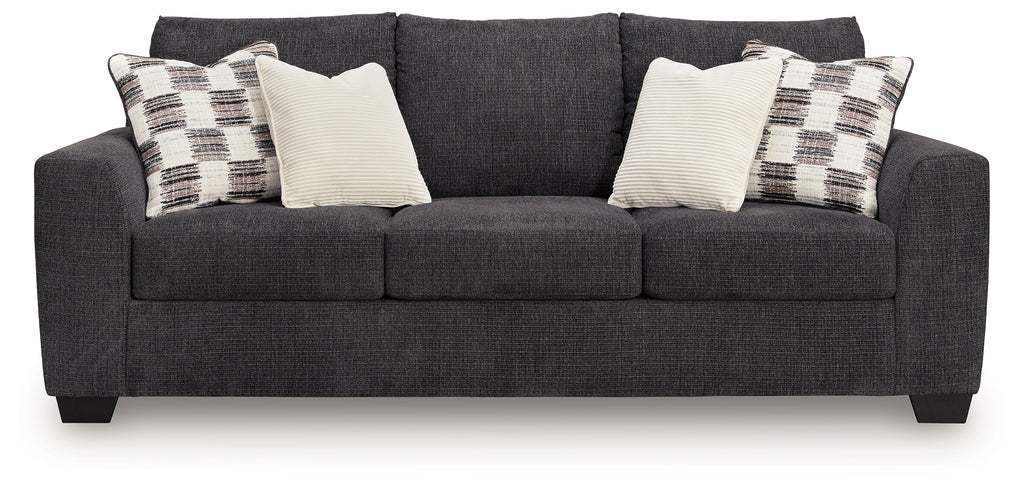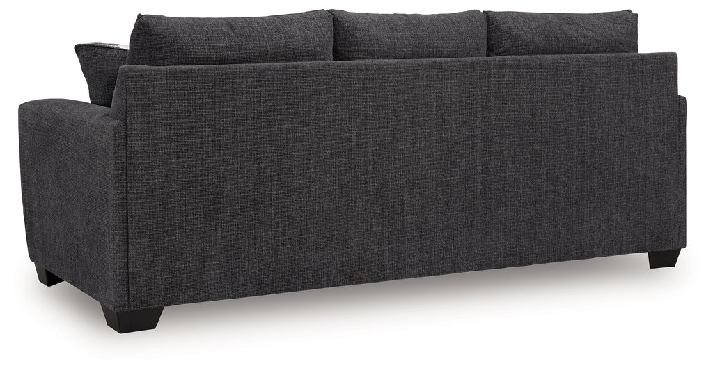 This sofa personifies contemporary comfort. Its clean-lined frame and neutral color lend must-have versatility. Softly textured fabric makes it that much more inviting. A welcome combination of chic style and a cozy feel, this piece completes your living room with modern flair.