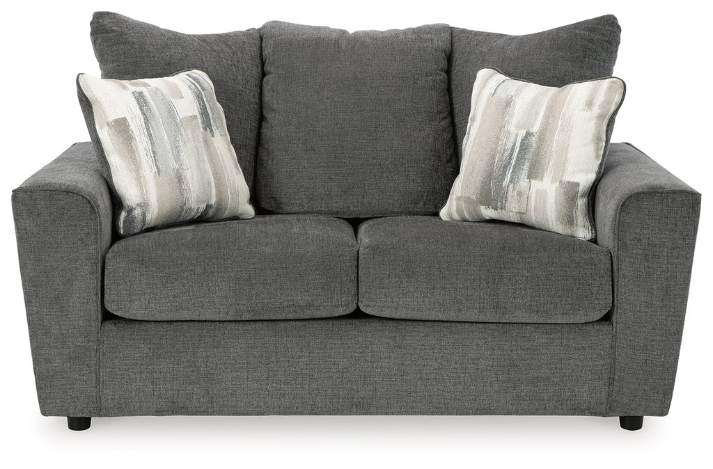 What’s new in neutrals? Shades of gray, of course. Embrace the sophisticated design trend with this gorgeous loveseat, which offers a clean-lined, contemporary style at a comfortably cool price. Sure to lift your spirits, the plush chenille fabric is fabulously neutral. Modern flared arms give it a distinctive flair. This loveseat also arrives with two cool brushstroke accent pillows to elevate the taste and comfort level.