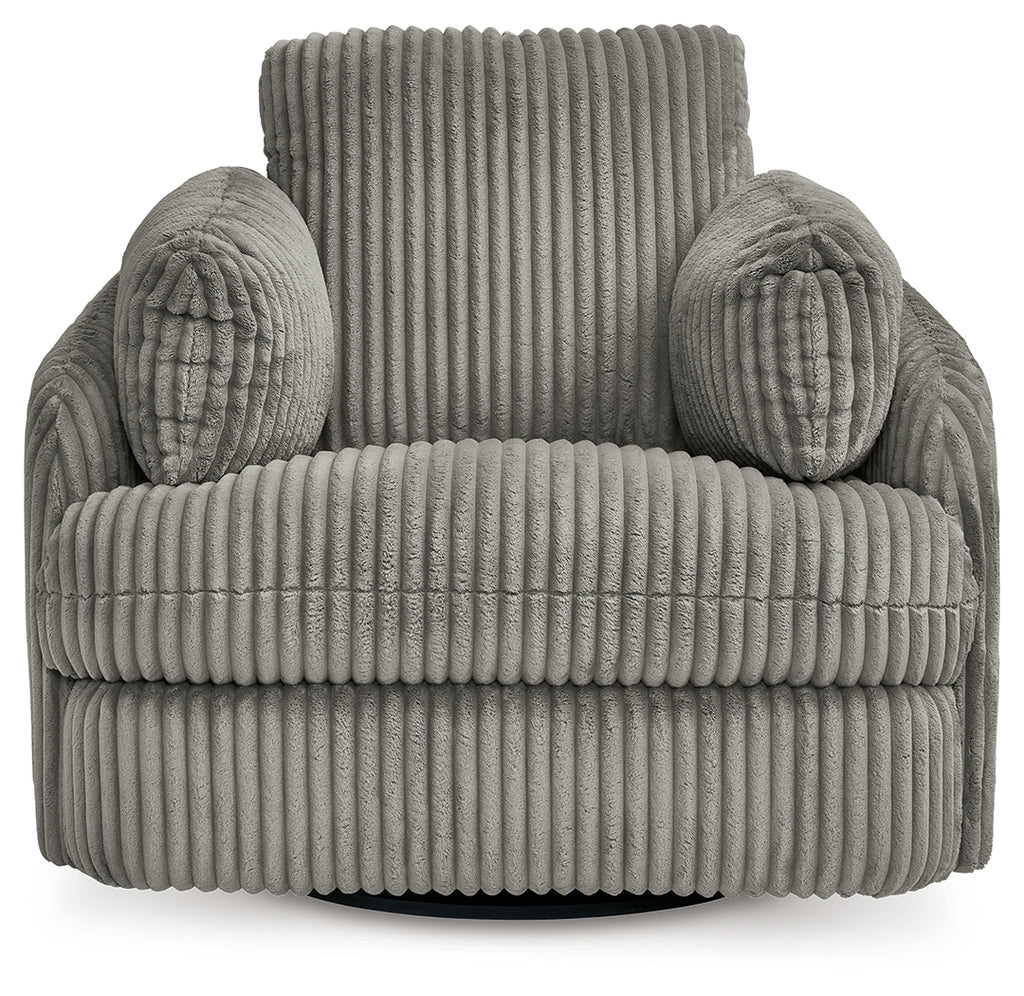 Like a warm hug, this recliner envelops you in comfort with its barrel shape and soft cord upholstery. It reclines, glides, and swivels to cater to your every need. This chair also features posh bolster pillows and cleverly designed storage. Unwind and cuddle up in your new cozy place.